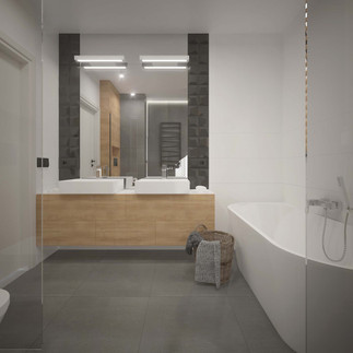 Ideą projektu było stworzenie funkcjonalnej i przyjaznej przestrzeni dla czteroosobowej rodziny. Budynek składa się z dwóch kondygnacji: parteru oraz piętra. Parter stanowi strefę dzienną, która została zaprojektowana, jako praktyczna, elegancka przestrzeń otwarta. Wszystkie elementy przestrzenne: ściany, podłogi, sufit mają wyznaczać strefy funkcjonalne oraz tworzyć klimat wnętrza. Płaszczyzny te zostały potraktowane, jako tło, pierwsza warstwa obrazu, którą uzupełniają pozostałe elementy wystroju wnętrz: meble, oprawy oświetleniowe, dodatki. Jasne wnętrza utrzymane w kolorach bieli, szarości oraz drewna zostały uzupełnione dodatkami w kolorach antracytu i mosiądzu. Jasna podłoga złożona z wieloformatowych płytek gresowych wyznacza strefę komunikacji oraz pokoju dziennego. Kuchnię oraz wiatrołap wyznacza ciemniejsza, szara płytka. Sufit to neutralna, biała płaszczyzna, która ma podnosić optycznie pomierzenia oraz nawiązywać do idei nieba / światła. Poszczególne ściany to prostokątne pola materiałowe takie jak biała farba, biała płytka klinkierowa oraz panel fornirowany w kolorze orzecha. Wszelkie otwory miały zostać możliwie niewidoczne, a podziały zminimalizowane. Do realizacji tego zadania użyto drzwi firmy DRE. Szczególną uwagę, na jakość minimalistycznego detalu przywiązywano do płaszczyzna drewnianych. Tutaj zastosowano drzwi ukryte, których obecność zdradza jedynie czarna klamka, która wraz z czarnymi gniazdkami i włącznikami stanowi jedną biżuterię ściany. Drewniane ściany przechodzą w drewniane schody, które sygnalizują wejście na ciepłe, przytulne wnętrze piętra – strefy nocnej. Drewno schodów przechodzi w drewnianą płaszczyznę podłogi, która prowadzi do sypialni. Ściany są białe, łącznie z drzwiami, żeby rozjaśnić wąską przestrzeń korytarza. Podobnie jak na parterze czystą biel dekorują jedynie czarne klamki i osprzęt elektryczny.